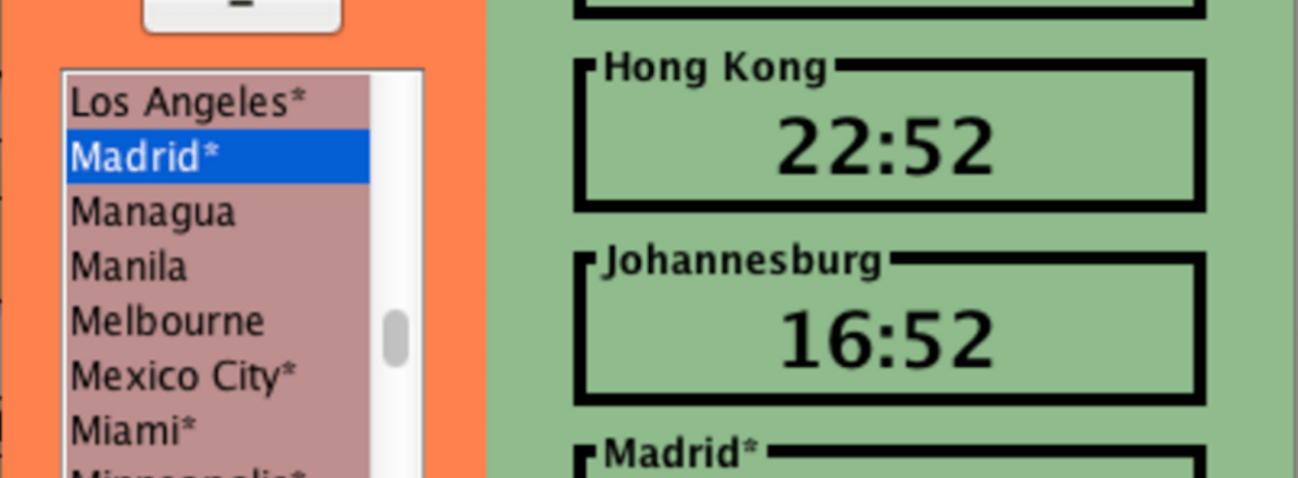 Our final project was to develop an application that will allow users view several times (or clocks) on their screen simultaneously. This type of application is often packaged in Smart-phones and other devices. The application was to provide the user with a list of cities/locations to choose from. The user should be able to select one (or more) cities and then click on the “plus” button (or its equivalent) to add them to the display. Selecting a city or cities and clicking on the “minus” button (or its equivalent) should remove those cities from the display. This projects, and smaller ones before this, displayed the use of layout managers, containers, colours, fonts, borders, spacing and so on.