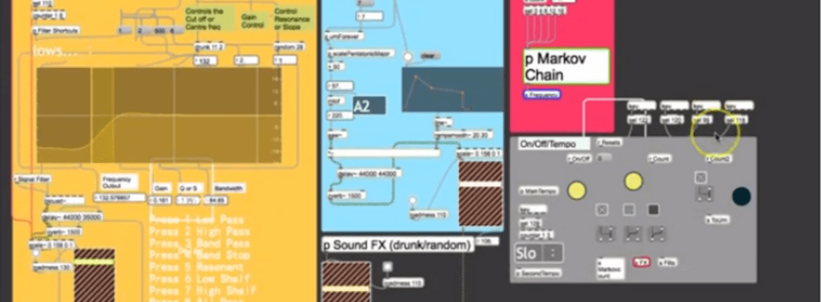 The patch demonstrated below features Markov Chain and random, drunk, and urn. Our aim as a group was to manipulate the stochastic behaviour of the algorithms in such a way that is was still pleasing i.e. or notes were random but only within specific scales in order to sound pleasing.