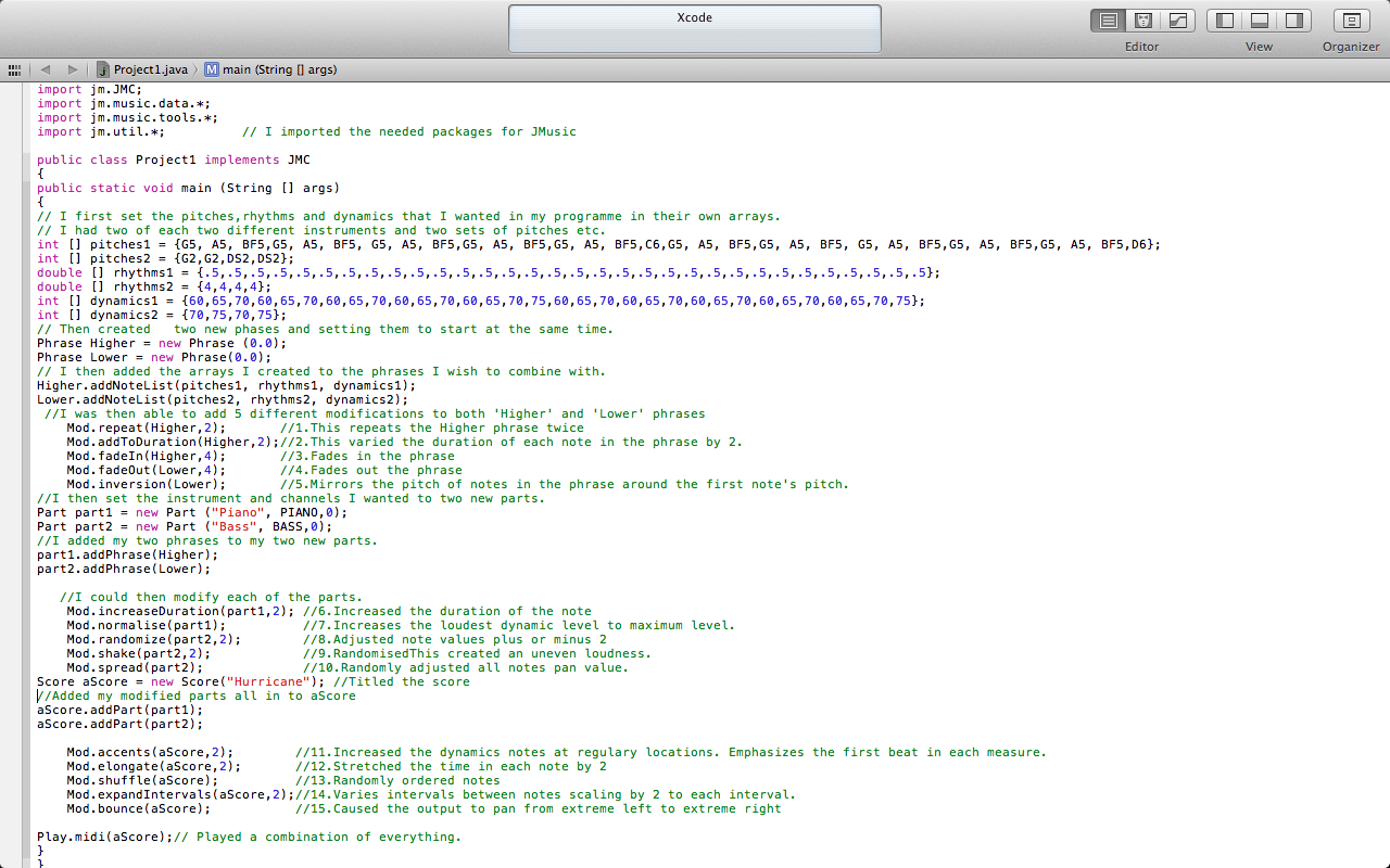 Project 1: Within this project, I wrote a programme which used arrays, phrases, parts and scores to give a midi output. As seen in the image I first declare my variables. Phrase then sets the time I want the melody to begin. Part sets the instruments and channels I wish to use. Ultimately these all go to aScore. During this process I add modifications to each part to display what Jmusic is capable of.
