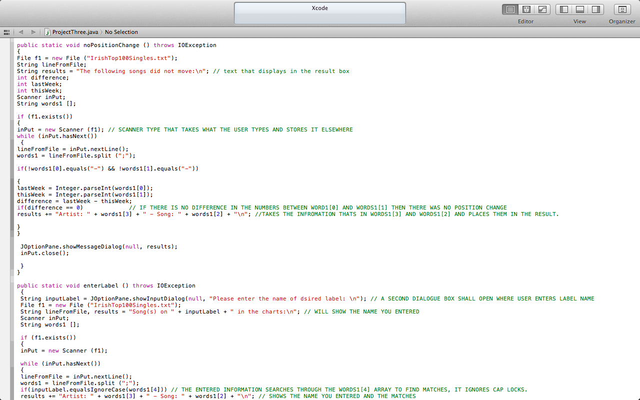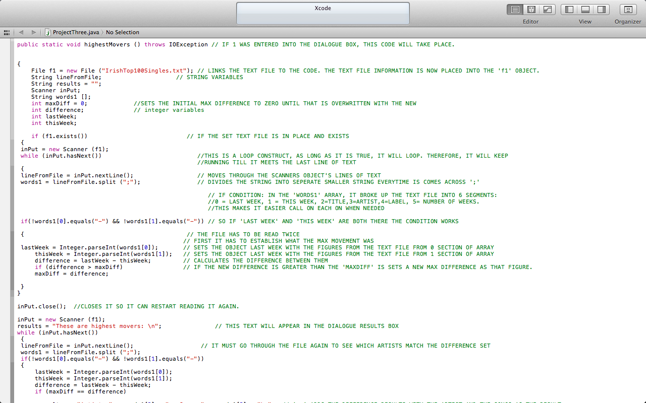 During my 1st year studying Media Programming, learning the basics of the Java language was foundational. We would practice different coding each week so we would become familiar with inputting data, why we were inputting it, what to expect and also how to troubleshoot errors we come across. Below I have taken screenshots of the three projects that made up part of our end term. The projects were a mixture of sound, using JMusic library, and user input. Click on the images below to see my work and explanation of specific segments of code.